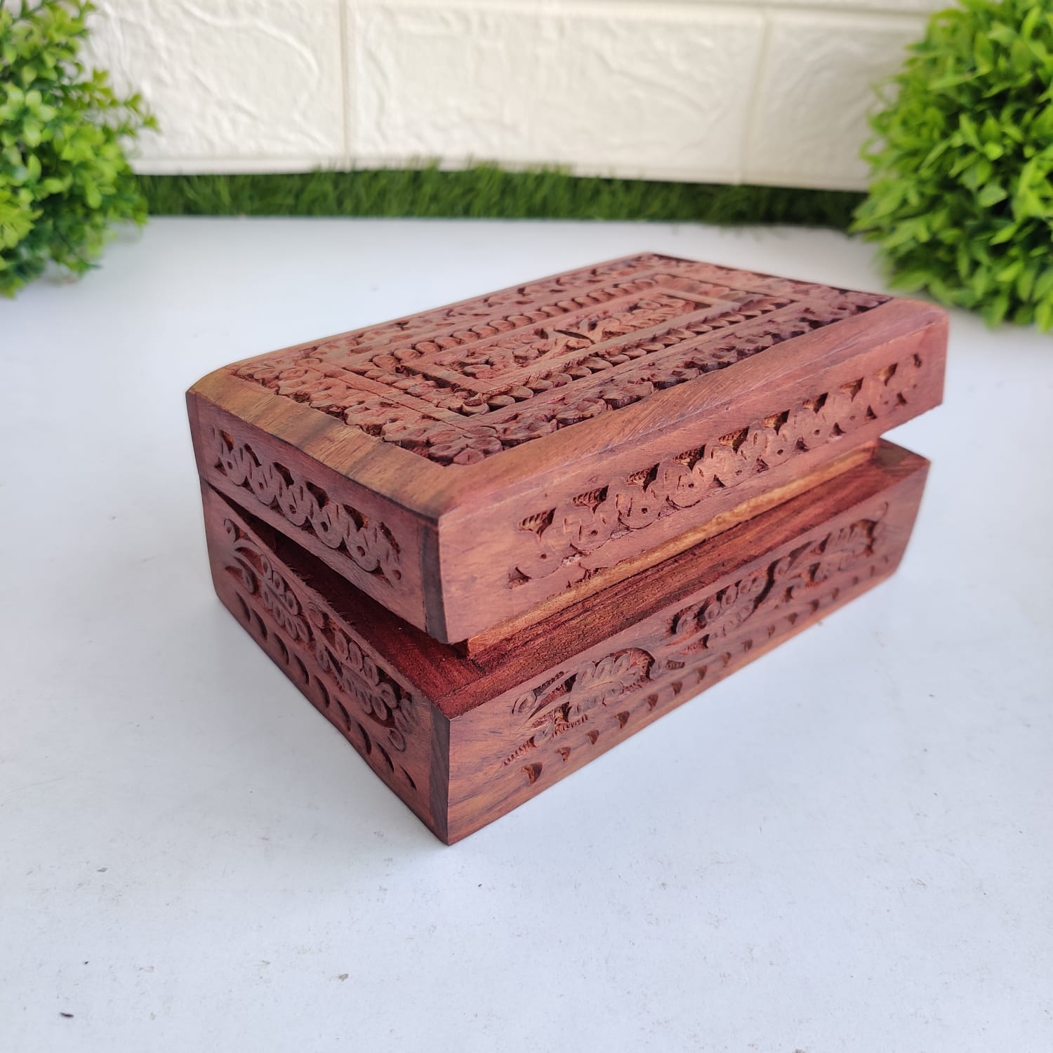 This expertly crafted small jewellery box measures 6 by 4 inches and features intricate wooden carvings that enhance its aesthetic appeal. Its compact size makes it ideal for securely storing rings, earrings, and other small valuables while adding a touch of elegance to any dresser or vanity. The sturdy wooden construction ensures durability, making it a timeless storage solution for your precious pieces.