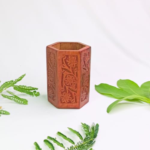 Enhance your desk with this Brown Wooden Carved Pen Stand, expertly crafted for both style and functionality.