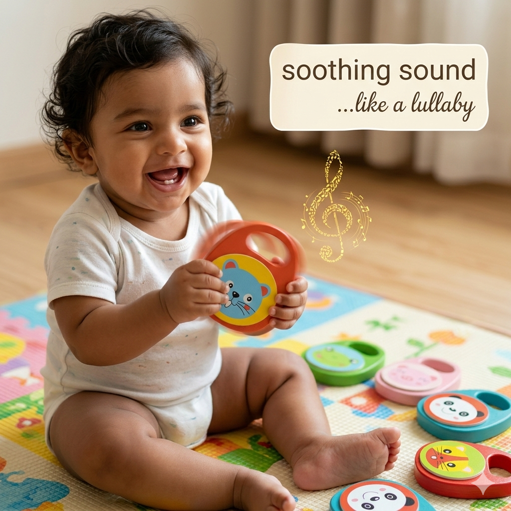 • 🎵 Cheerful wooden castanet rattle that makes delightful clicking sounds