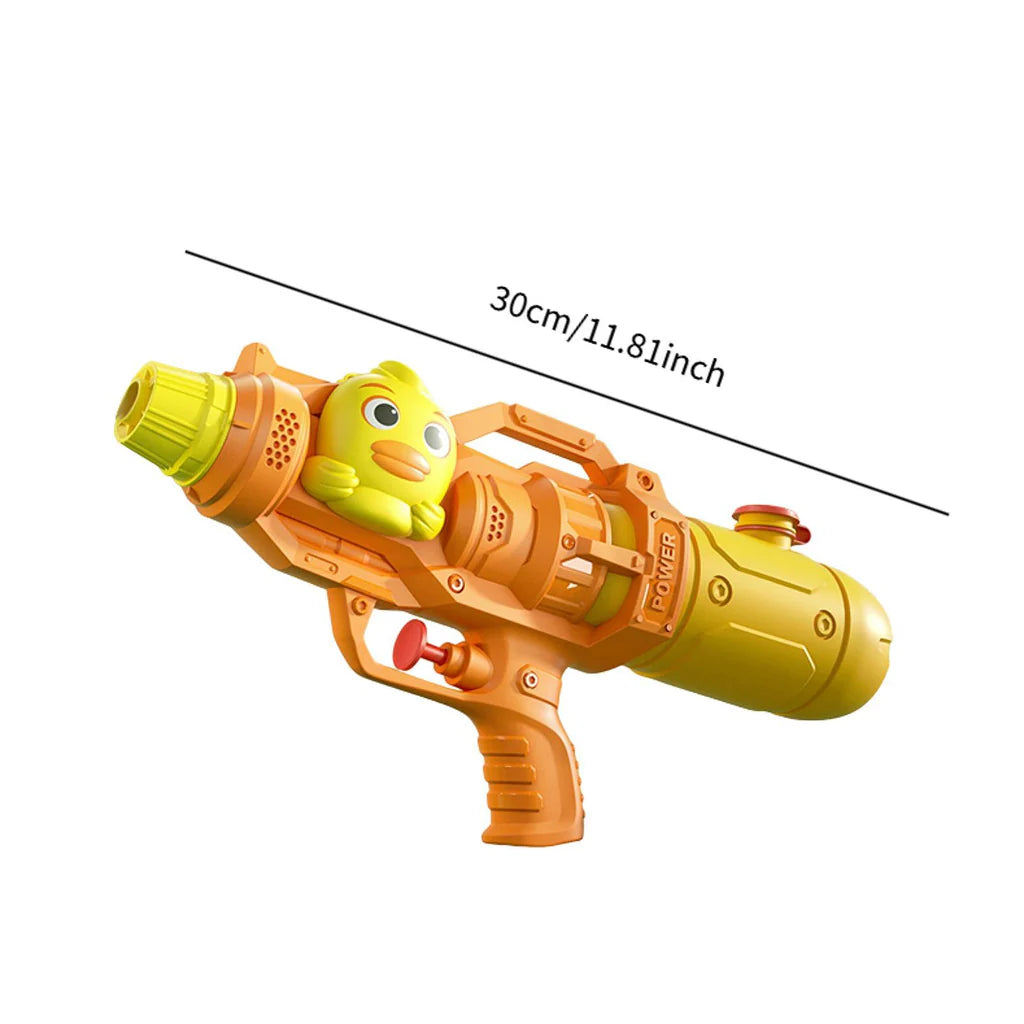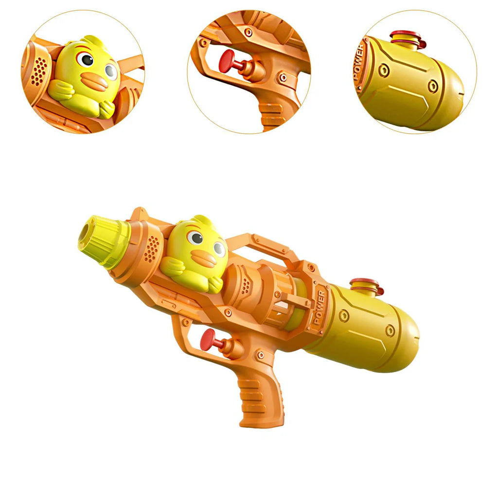 Duck-shaped water gun with a 500ml capacity, perfect for summer outdoor play and water activities. The ergonomic design fits comfortably in children's hands, making it easy to aim and spray. Ideal for backyard games, pool parties, and hot-weather fun. Durable construction withstands repeated use and refilling. A classic toy that encourages active play and social interaction among kids. Simple to fill and operate, requiring no batteries or complex setup.