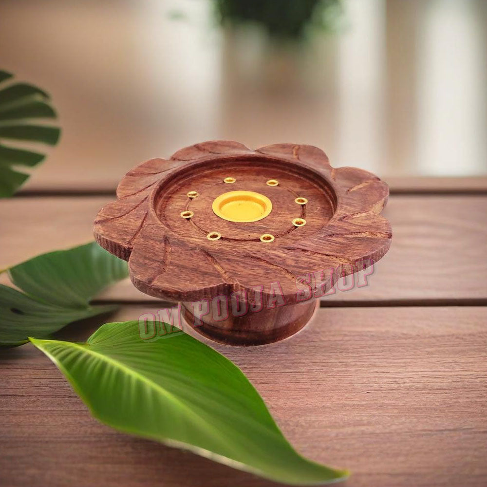 This Flower Shape Brown Wooden Incense Holder is expertly designed to hold both agarbathi and sambrani sticks securely. Made from durable natural wood, its elegant floral shape adds a touch of artistry to your sacred space. Enhanced with subtle divine emojis, it brings a spiritual significance while ensuring a stable and clean burning experience.