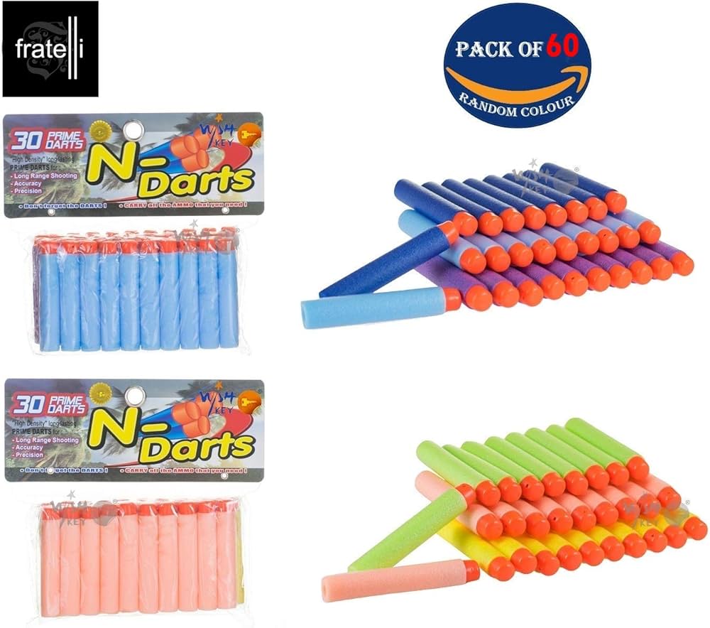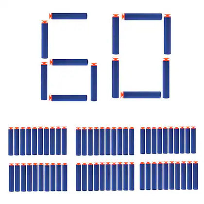 Foam Dart Bullets – 60 Piece Pack Stock your arsenal with 60 soft foam darts engineered for safe, high-impact play. Each dart features a weighted tip for consistent flight and accuracy, while the cushioned foam construction absorbs impact without causing injury. Compatible with most standard foam dart blasters, these bullets deliver reliable performance across indoor and outdoor play sessions. Ideal for solo practice, competitive games, or group battles, this bulk pack ensures you'll never run short during extended play. Durable foam resists wear, making these darts a cost-effective choice for frequent users and enthusiasts alike.